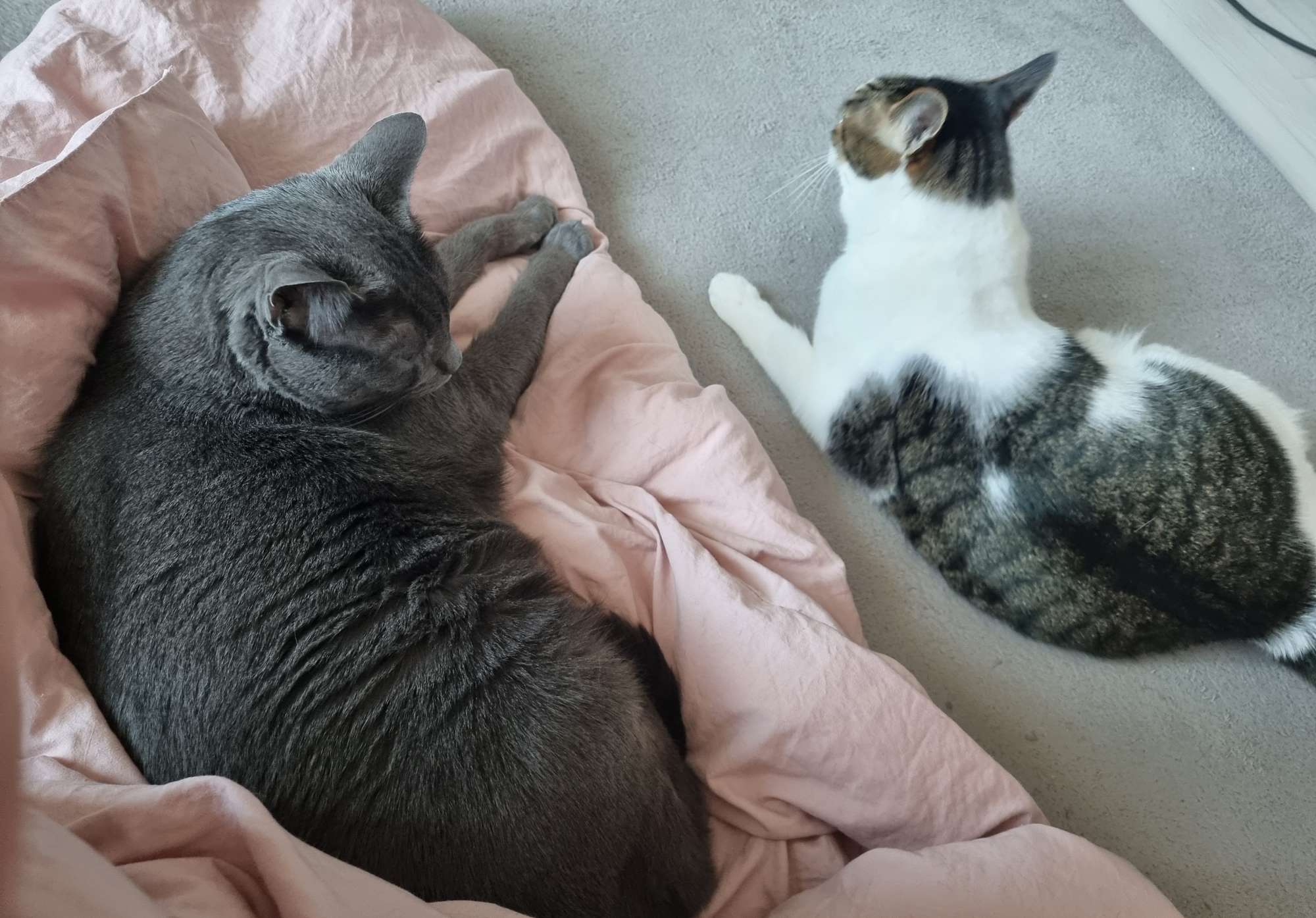우리 냥이 두마리가 한참 눈으로 대화를 하더니 같이 나란히 누워 있길래 이게 왠일 하며 좋아했는데요