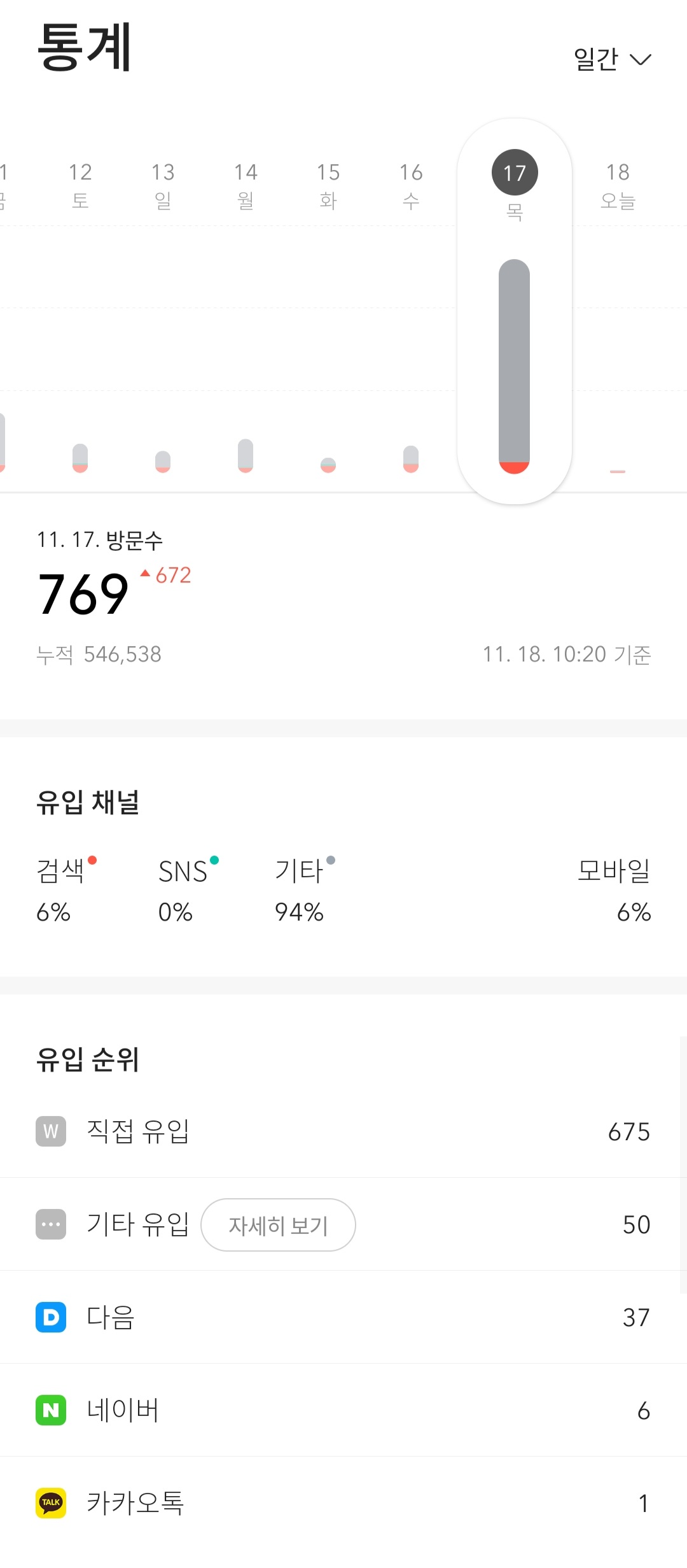 소소한 일상 방문자 직접유입? by 제이제로 누나 2022. 11. 18. 728x90 반응형 어제저녁 갑자기 방문자가 700명대를 넘어 혹시 노출되었나 확인해보니 직접유입 방문자가 670명이 넘어서 너무 당황했네요 도대체 어디서 유입된 걸까요금요일이네요 오늘도 파이팅입니다 반응형 공유하기 게시글 관리 제이제로 집사의 소소한 일상 '소소한 일상' 카테고리의 다른 글 오랜만에 샌드위치 (32) 2022.11.23 주말에 제이제로 다음노출 (28) 2022.11.21 오늘 점심은 빅맥 (28) 2022.11.11 쌀쌀한 아침 (38) 2022.11.09 오늘 점심은 (32) 2022.10.27 관련글 오랜만에 샌드위치 주말에 제이제로 다음노출 오늘 점심은 빅맥 쌀쌀한 아침 댓글