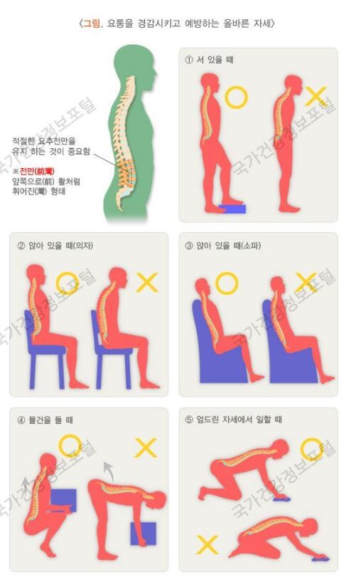 평상시에 올바른 자세를 유지하고, 바른 자세를 취하는 요령을 숙지하는 것이 허리 통증을 예방하고 치료하는 데 중요합니다.