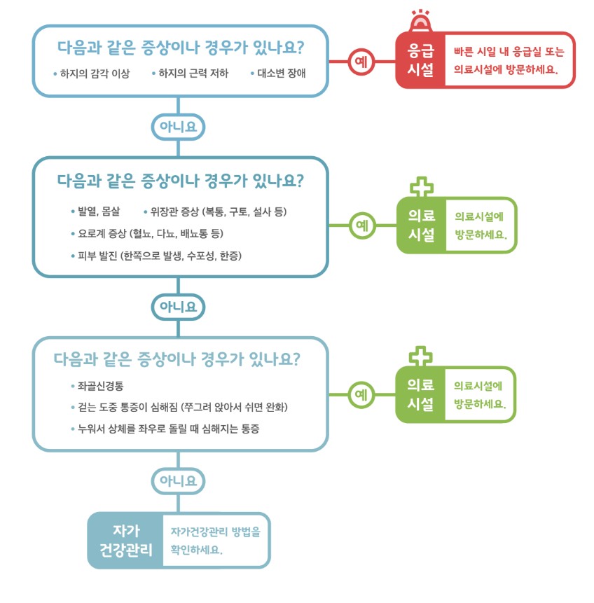 - 대소변의 장애(변의나 요의가 있으나 배출이 되지 않는 증상 또는 의지와 다르게 대변이나 소변이 새는 증상) 또는 다리 근력의 약화, 하지의 감각 이상 등의 증상이 동반되는 경우에는 즉시 병원 진료를 통한 전문의 진료가 필요합니다. (합병증 발생 위험이 높은 응급상황)
